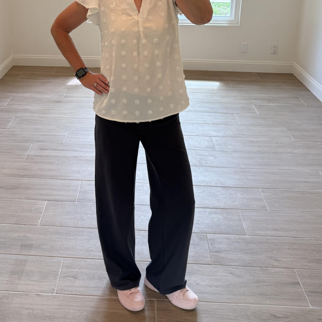 Answer 2: The pants feature a flattering high-waisted cut and a wide-leg design, providing ample room for movement. They are made from premium soft, stretchable fabric that balances flexibility and breathability, ensuring all-day comfort.